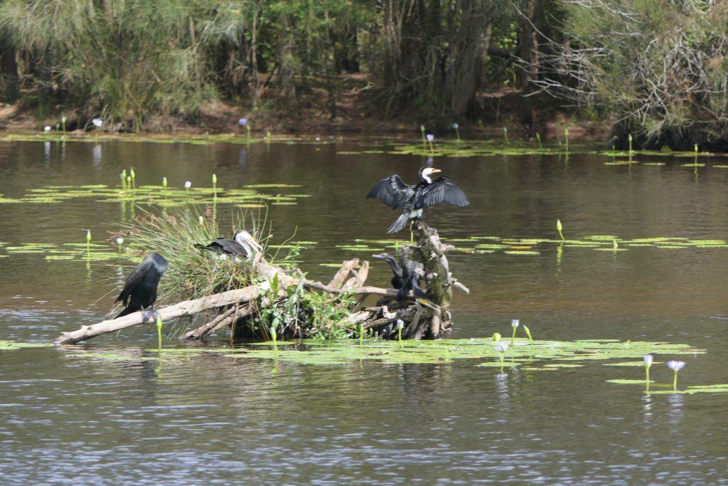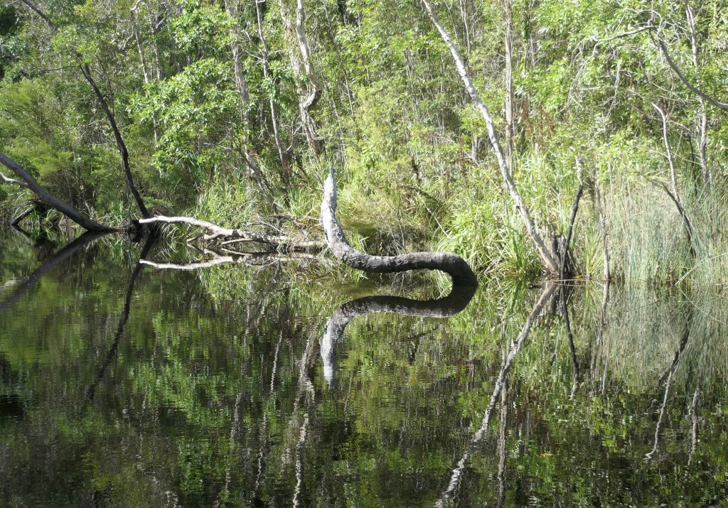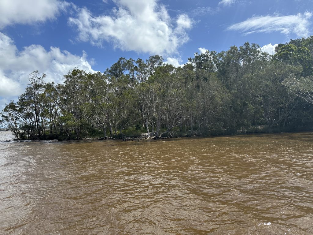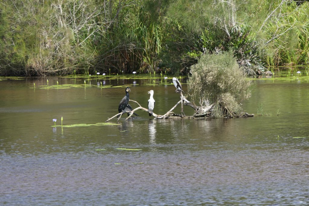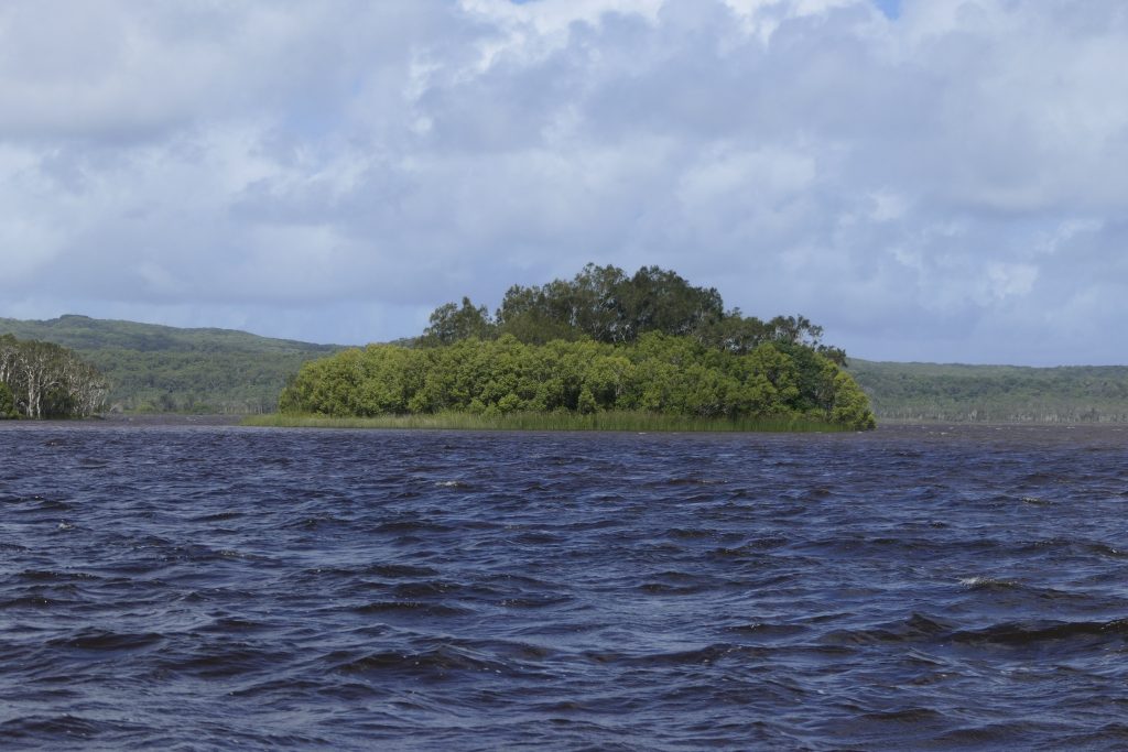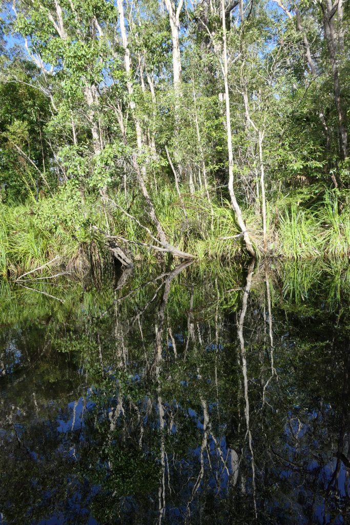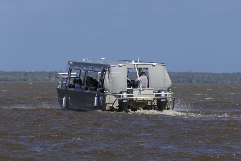 Auf einem Boot ging es dann zunächst über den See zum Noosa River. Der See und der Anfang des Flusses sind aufgrund des geringen Tiefgangs und der Tanine im Wasser rot-braun gefärbt. Je weiter man flussaufwärts kommt, desto klarer wird das Wasser aufgrund der unterirdischen Süßwasserquellen, die das Wasser zuführen.