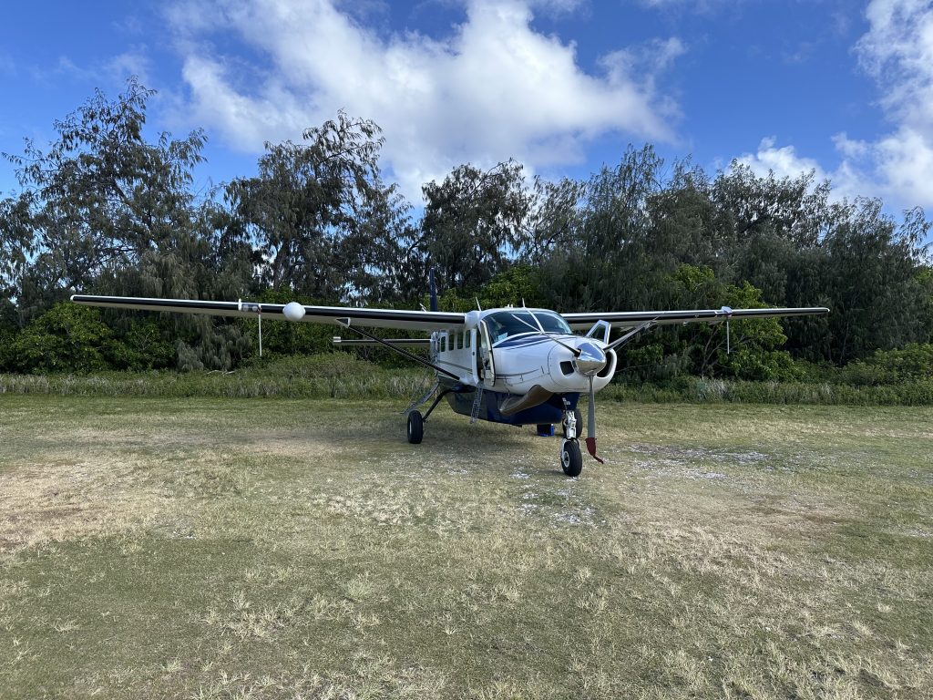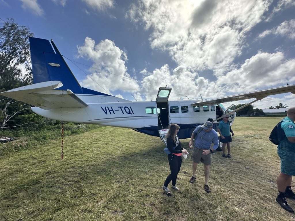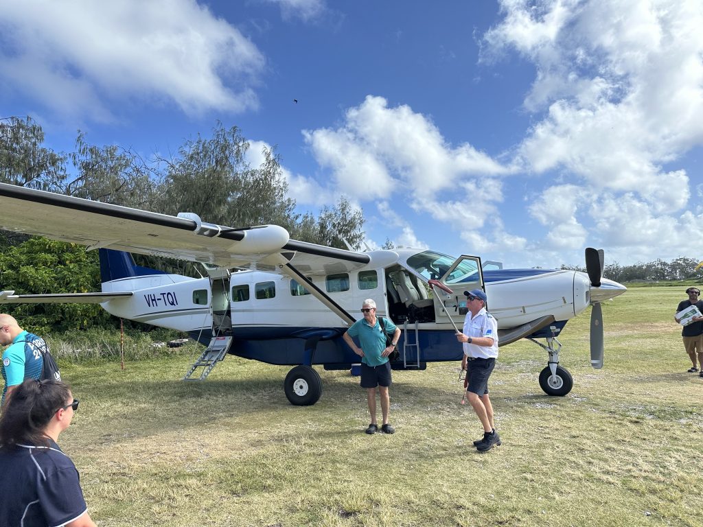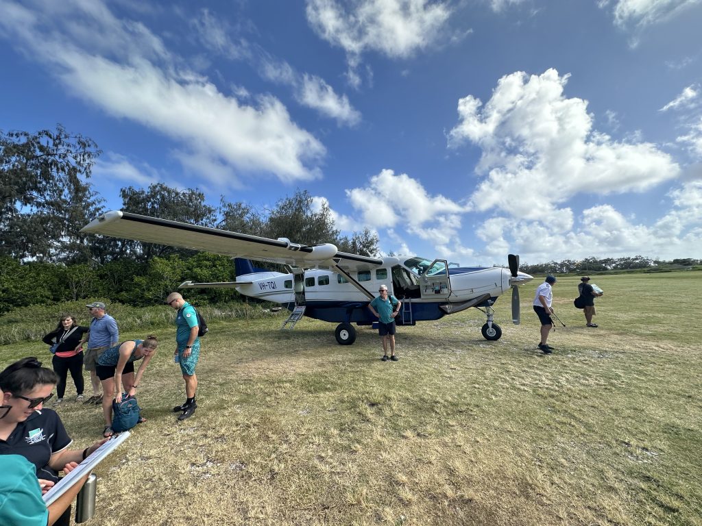 Um kurz vor neun Uhr dann eine etwas holprige Landung auf der 650m langen Graspiste von LEI, der südlichsten Insel des Great Barrier Reef, gut 100km vor der Küste des Festlands.