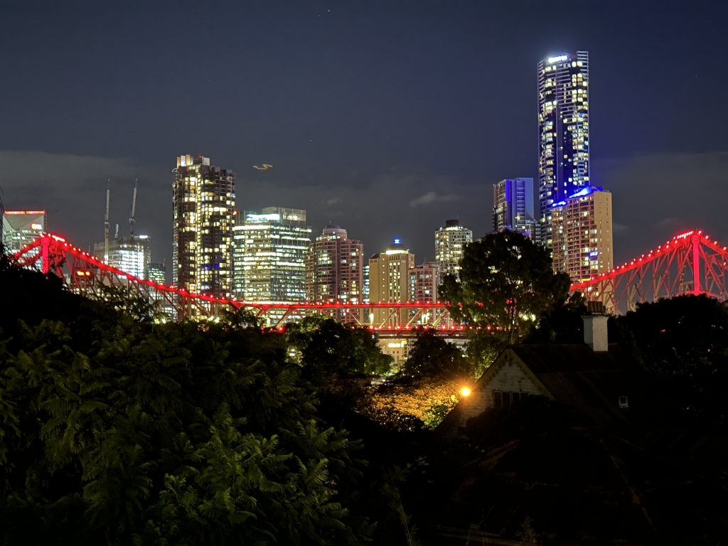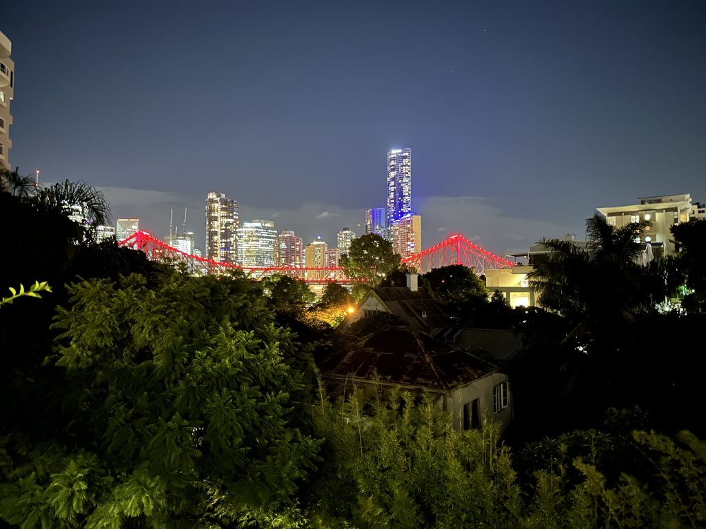 Nach einem leckeren Abendessen im Hotel, gönnten wir uns noch einen Drink in der Rooftop Bar und einen letzten Blick auf die heute rot beleuchtete Story Bridge.