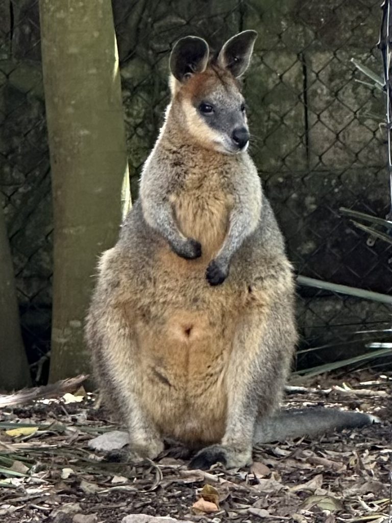 Viele Hintergrundinformationen erhielten wir bei der Sanctuary Tour am Nachmittag. Insbesondere zur Ernährung der Tiere. Z.B. fressen Koalas wohl immer nur 4 bestimmte Sorten Eukalyptus, weil sie nur diese verdauen können. Dazu werden die entsprechenden Eukalyptusblätter / -äste in einer aufwändigen Logistik in den Zoo transportiert. Und da die Koalas immer nur die frischesten Blätter essen, gibt es einen Zweit- und Drittverwendung für den Eukalyptus, den der verwöhnte Koala nicht mehr anschaut…