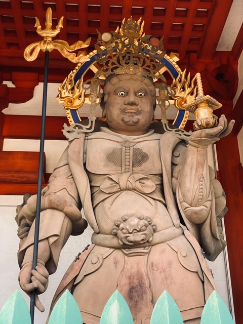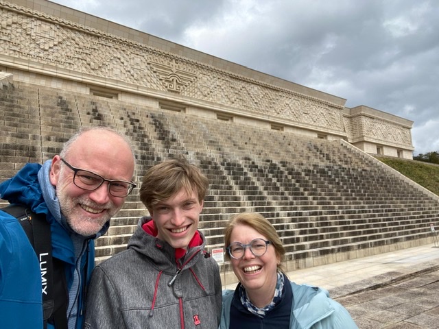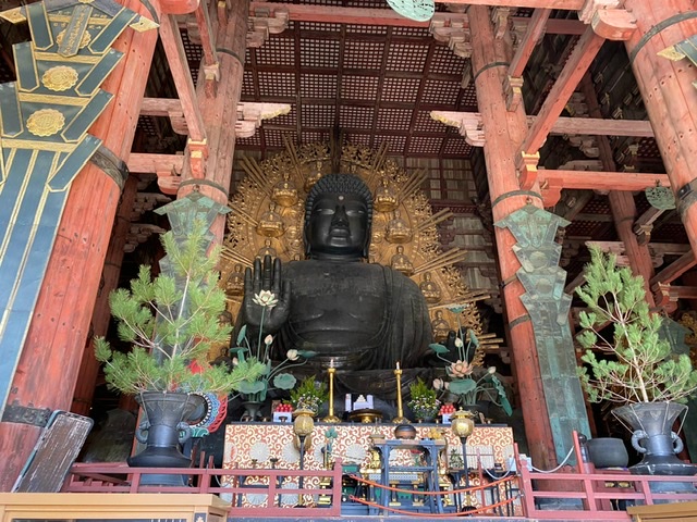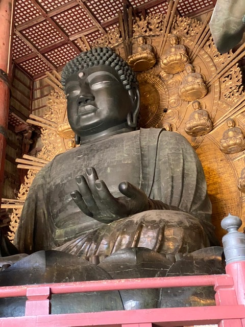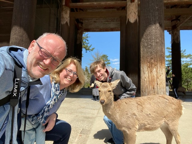 Bei strahlendem Sonnenschein genossen wir den Tag in der alten Kaiserstadt Nara. Nara bedeutet „Reh“ und deshalb begegnet man auch überall welchen: in Läden, Restaurants und natürlich im weitläufigen Park! Dort kann man die handzahmen Tiere füttern und streicheln. Sie verbeugen sich sogar ganz höflich dafür. Im Todai-Hi Tempel aus dem Jahr 745 sitzt der weltgrößte Bronze-Buddha – sehr imposant! Dort haben wir Bao aus Bremen kennengelernt – er studiert seit September für ein Jahr in Tokyo BWL. Adrian und er haben ihre Kontaktdaten für später ausgetauscht. Nach zehn Kilometern waren wir platt und sortieren jetzt die Fotoflut…