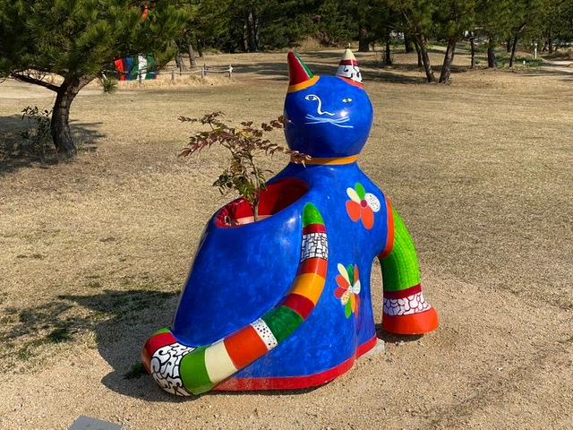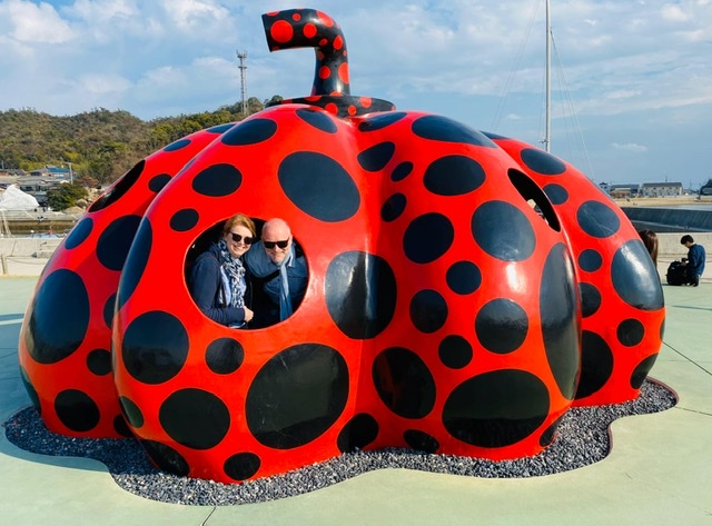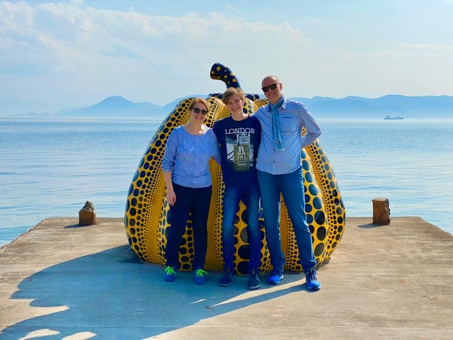 Während dieser außergewöhnlichen Krisenzeit zu reisen, ist tatsächlich sehr unwirklich. Wir hoffen, Euch ein klein wenig auf unsere tolle Reise mitnehmen zu können und so die Zeit zu Hause zu bereichern. Wir machen uns natürlich viele Sorgen um unsere Familie und Freunde, aber es wäre aktuell auch wenig nützlich, wenn wir direkt zurück fliegen würden. Wir nehmen daher Kanzlerin Merkel besonders Ernst: „Im Moment ist nur Abstand Ausdruck von Fürsorge.“ – Heute waren wir auf der kleinen Kunst-Insel Naoshima vor Takumatsu. Dort fuhren wir bei Traumwetter mit dem Fahrrad zu verschiedenen Kunstobjekten. Im außergewöhnlichen Chichu-Art-Museum darf leider nicht fotografiert werden – hat uns aber sehr beeindruckt! Am Abend aßen wir leckeres Sukiyaki (Sojagericht mit Gemüse und dünn geschnittenen Rindfleisch) mit grandioser Aussicht. ?