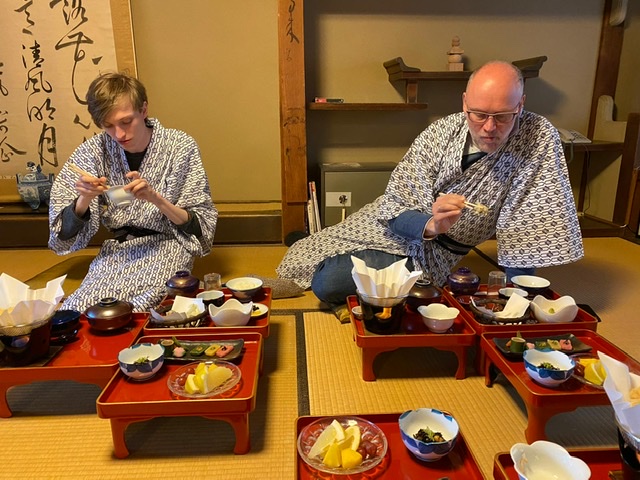 Von Kyōto ging es heute mit der U-Bahn, dem Shinkansen und der Panoramabahn nach Takayama. Das „Rothenburg ob der Japan“ liegt in den Bergen und tatsächlich liegt hier noch Schnee. Und hier merkt man die Coronakrise so richtig: ausländische Touristen fallen mittlerweile komplett aus und auch die Japaner halten sich mit Reisen zurück. In den historischen Gassen mit wunderschönen Holzhäusern aus der Edo-Zeit (vor etwa 400 Jahren) sind ca 60-70% der Läden und Restaurants geschlossen. Wir sind in unserem japanischen Gästehaus die einzigen Gäste und so ähnlich sieht es wohl auch in den anderen Unterkünften aus. Sehr surreal! Zum Tagesabschluss gingen wir noch in den hauseigenen Onsen (Bad mit heißer Quelle).