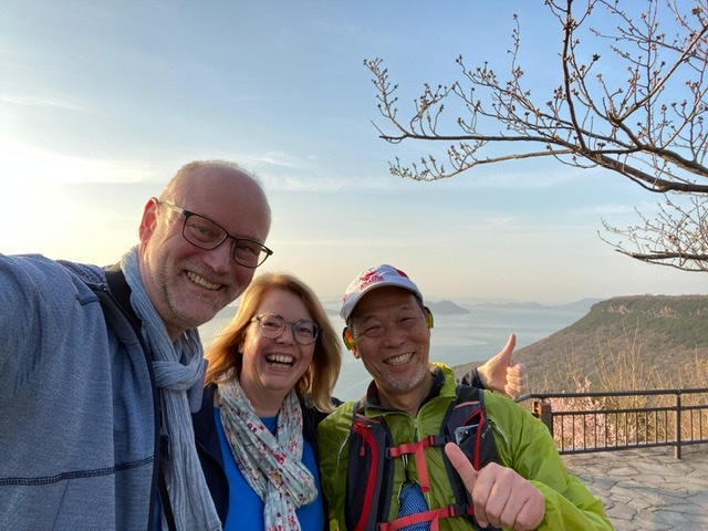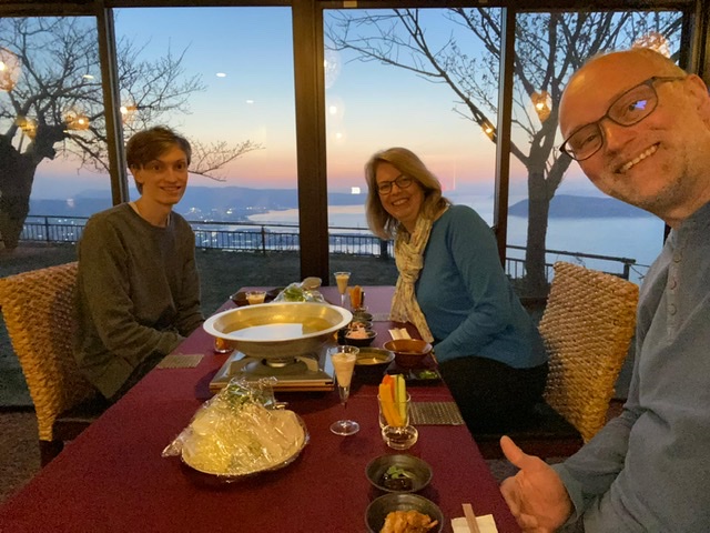 Mit Taxi, Shinkansen, Regionalzug und Bus sind wir auf der zweitkleinsten der fünf Hauptinseln von Japan, auf Shikoku in Takamatsu angekommen. Weit oben liegt unser wunderschönes kleines Hotel mit traumhaften Blick über die ganze Bucht. Natürliche haben wir noch einen netten Spaziergang zum nahegelegenen Tempel unternommen und uns angeregt mit einem japanischen Jogger (66 Jahre alt) unterhalten. Zum Abendessen gab es das traditionelle Shabu-Shabu – eine Art Fleisch- und Gemüsefondue mit heißer Brühe – köstlich!!!