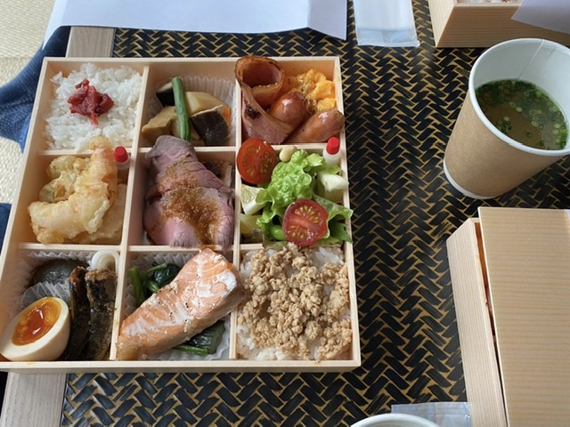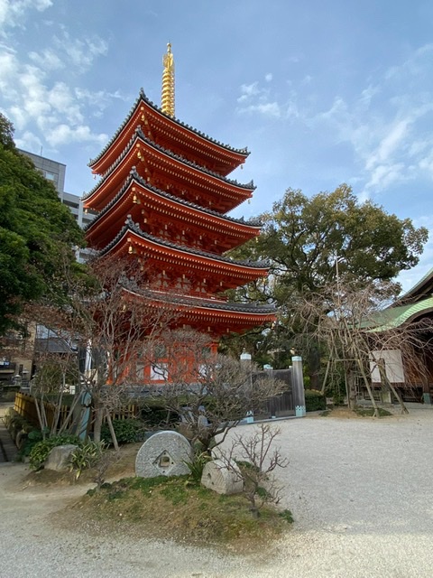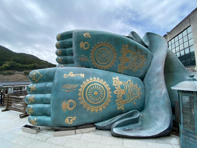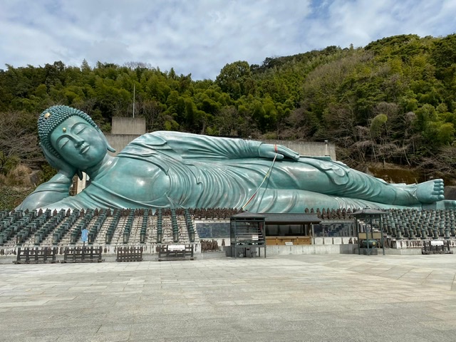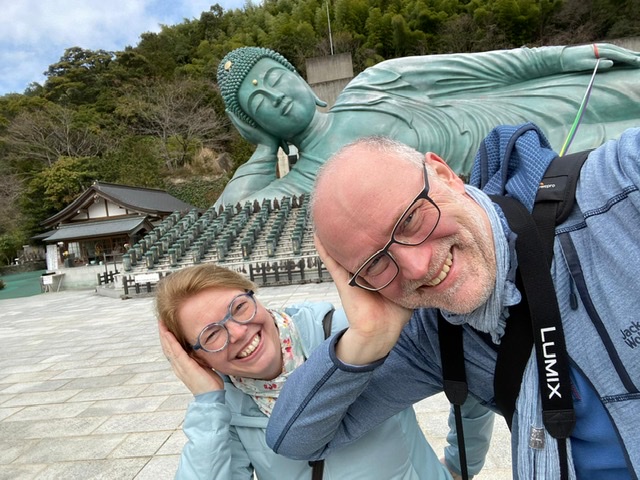 Nach unserem ruhigen Flug vom geisterhaft-leeren Frankfurter Flughafen, ging es über Tokyo nach Fukuoka. Unser Abendessen war ein köstliches Ramensüppchen (Nudelsuppe) um die Ecke. Am nächsten Morgen wurden wir vom Hotel auf dem Zimmer mit einer so genannten Bento Box zum Frühstück begrüßt. Wegen des Coronavirus wurde der Frühstücksraum und das Frühstücksbuffet geschlossen. Die japanisch-herzhaften Spezialitäten sind allerdings am frühen Morgen etwas gewöhnungsbedürftig… Danach machten wir uns mit dem Zug auf den Weg zum größten liegenden Buddha in Japan. Er ist über 100 Jahre alt, aus Bronze und eindrucksvolle 43 Meter lang. Eingebettet in einen wunderbaren Park mit vielen Schreinen liegt er malerisch am Hang.