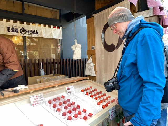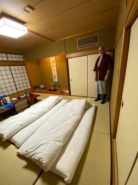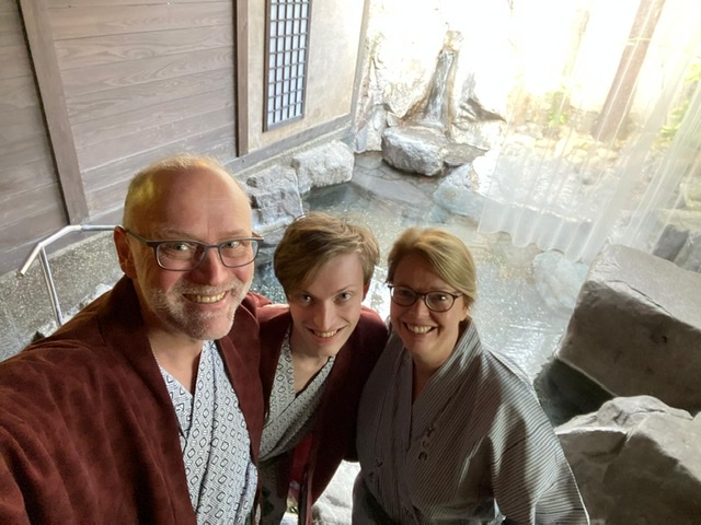 Den heutigen Sonntag haben wir sehr entspannt verbracht. Nach dem japanischen, sehr gewöhnungsbedürftigen Frühstück bummelten wir durch die Einkaufsstraße. Da gab es allerlei zu staunen und zu kosten… Am Nachmittag besuchten wir unseren Open-air-Onsen im Hotel, einem traditionellen Gästehaus. Das Quellwasser ist 40 Grad heiß ? und der Aufenthalt im Steinbecken ist ein Genuss! Heute werden wir bestimmt gut in unserem (harten) Futton schlafen können… ?