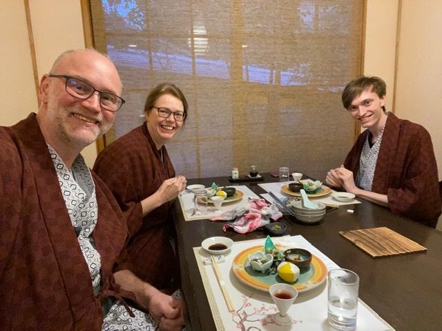 Den ersten Ortswechsel haben wir gemeistert! Und das ist wirklich nicht einfach… es gibt tatsächlich sehr wenig englische Hinweise. Die Japaner sprechen ein gewöhnungsbedürftiges Englisch und das auch nur selten. Aber nun sind wir im mondänen Badeort Yufuin. Wir haben tolles Wetter – aber es liegt hoch und es ist sehr frisch (unterer einstelliger Bereich). Daher konnten wir uns heute noch nicht zu einem Open-Air-Bad im Onsen entschließen. Dafür haben wir ein Katzencafé und den Stadtsee besucht. Ein traditionelles mehrgängiges Menü in Kimonos beendete unseren Tag. ?